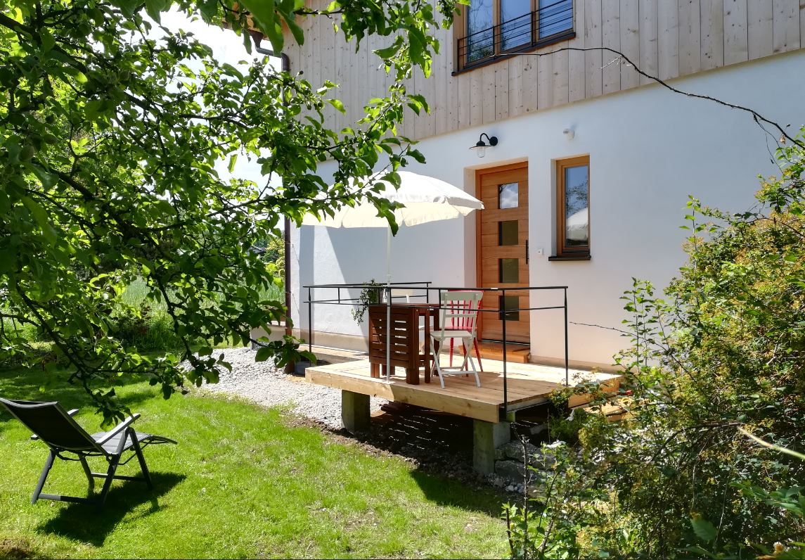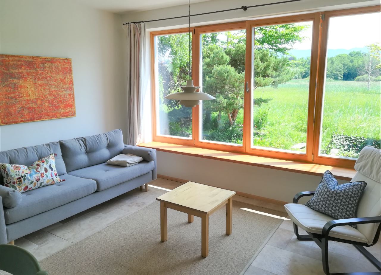 für ein angenehmes Wohnklima. Zur Ferienwohung gehört ein kleiner Garten mit Liegewiese. Vom Garten und der Wohnung haben Sie eine